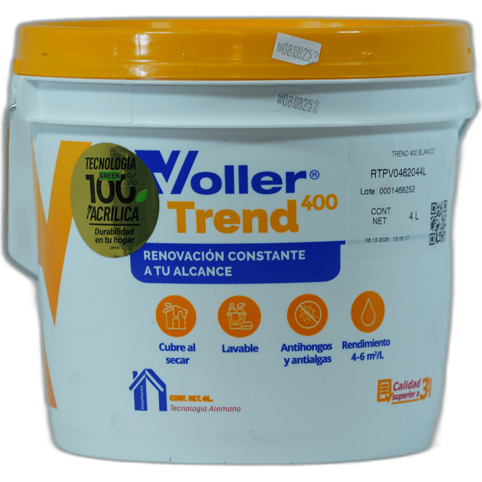 Pintura 100% acrílica para interiores, resistente a la alcalinidad, hongos y algas, sin olor y libre de metales pesados, ideal para renovar la decoración de espacios interiores.